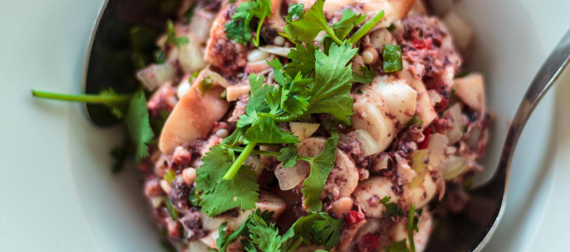 Der Octopus wird im eigenen Saft bei mittlerer Hitze ca. 30-40 Minuten gedämpft. Darauf achten, dass der Octopus nicht anbrennt - am besten mit einem Glasdeckel zudecken, so kann man sehen, wie sich die Hitze entwickelt.